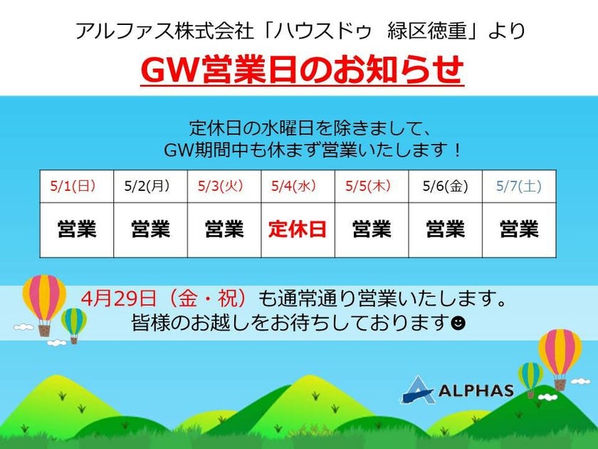 ハウスドゥ緑区徳重もGWは営業しておりますので、一緒に頑張りましょう!